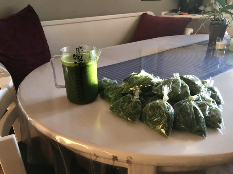Om du har grönkål kvar i trädgården så kör den i en juiceapparat och frys in. Resterna som blir kvar kan du också frysa in och använda i bröd, smoothies och i matlagning. Jag hade ett stort fång så det blev en bra skörd.